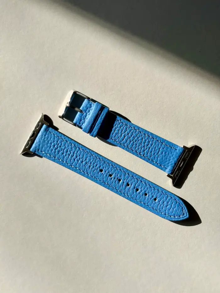 Our Apple Watch band, crafted from grained leather, combines a striking texture with a fresh blue hue. The subtle pebble-grain embossing adds depth to the leather and gives the band a vibrant look. Handcrafted for superior comfort and a stylish appearance.