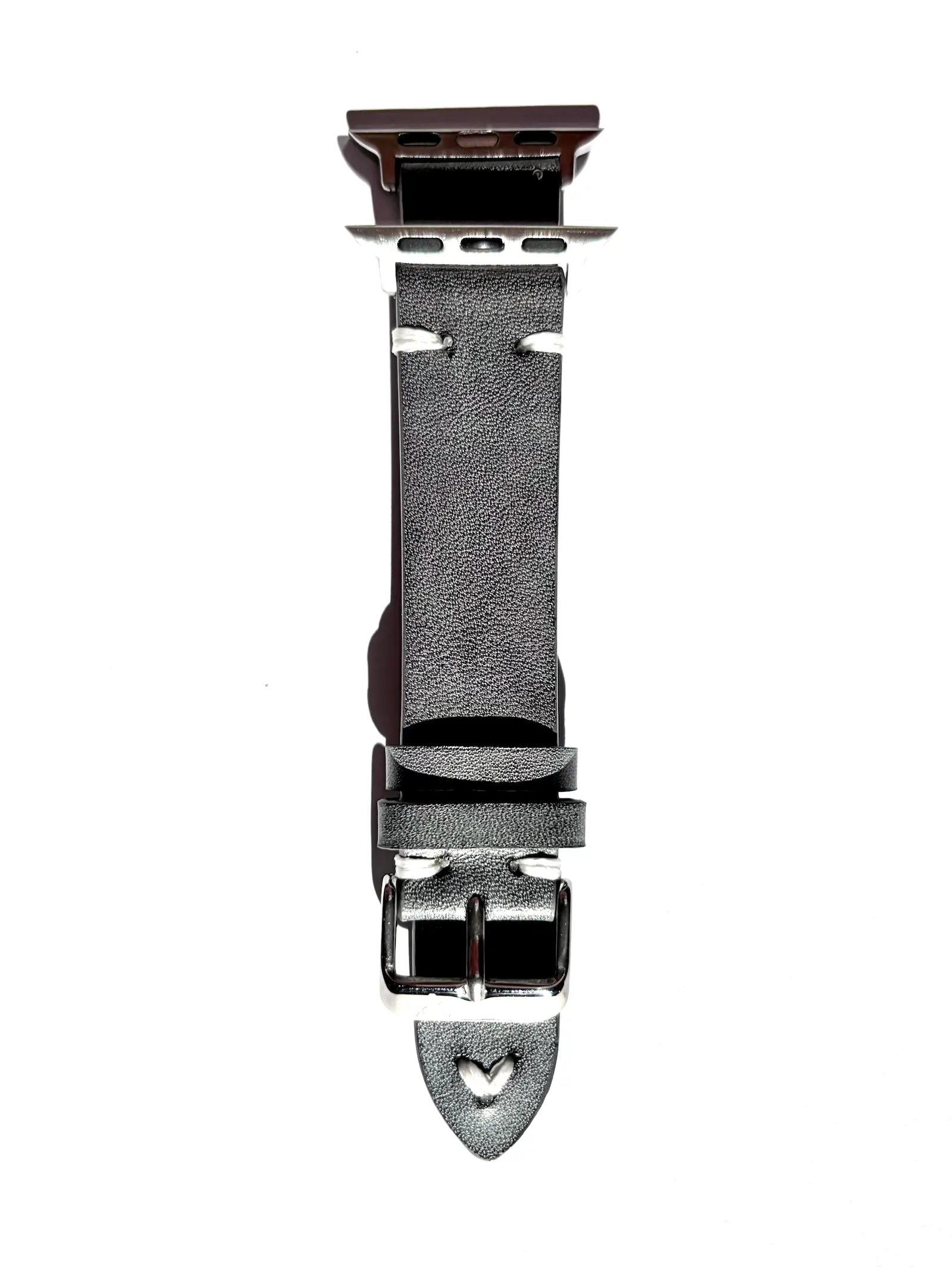 Our Apple Watch band in the Basalt color, inspired by dark volcanic rock with a calming appearance. Firm, smooth leather and strong thread combine to create a remarkably harmonious band.