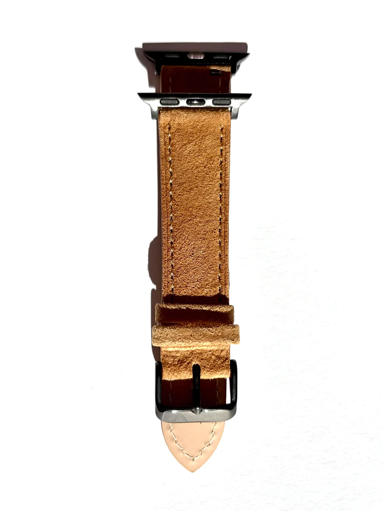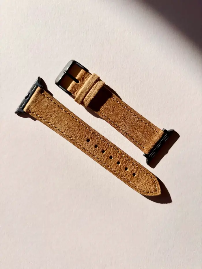 Our Apple Watch strap in a beautiful amber-colored light brown made of fine suede. Crafted from fine suede with a smooth leather interior.