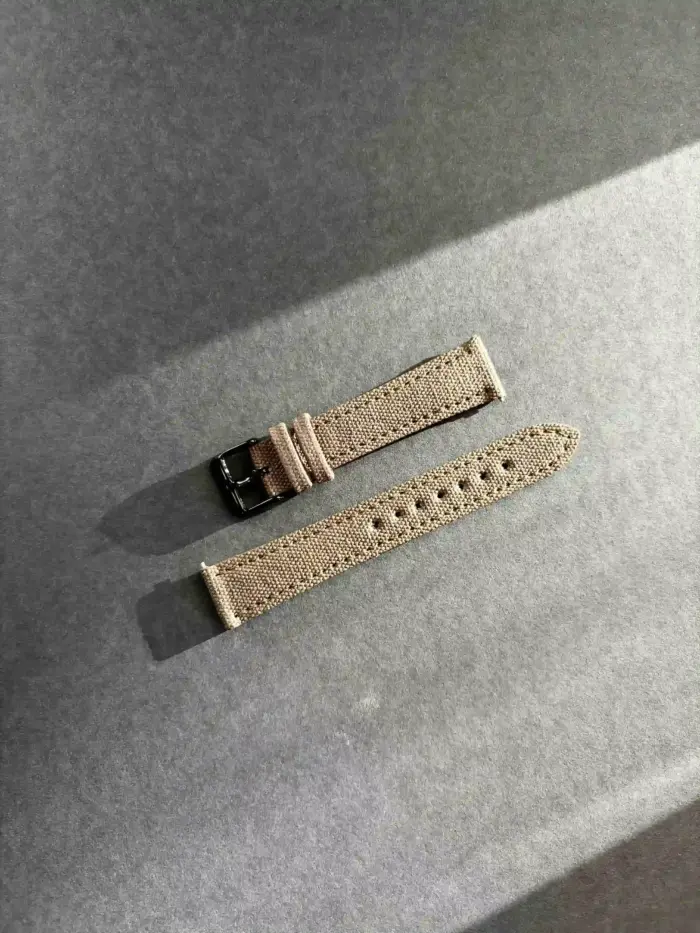 Our fabric watch strap combines robust canvas in a stylish greige (grey-beige) on the outside with soft leather on the inside for optimal comfort. It gives your watch a modern look that combines everyday practicality with elegance.