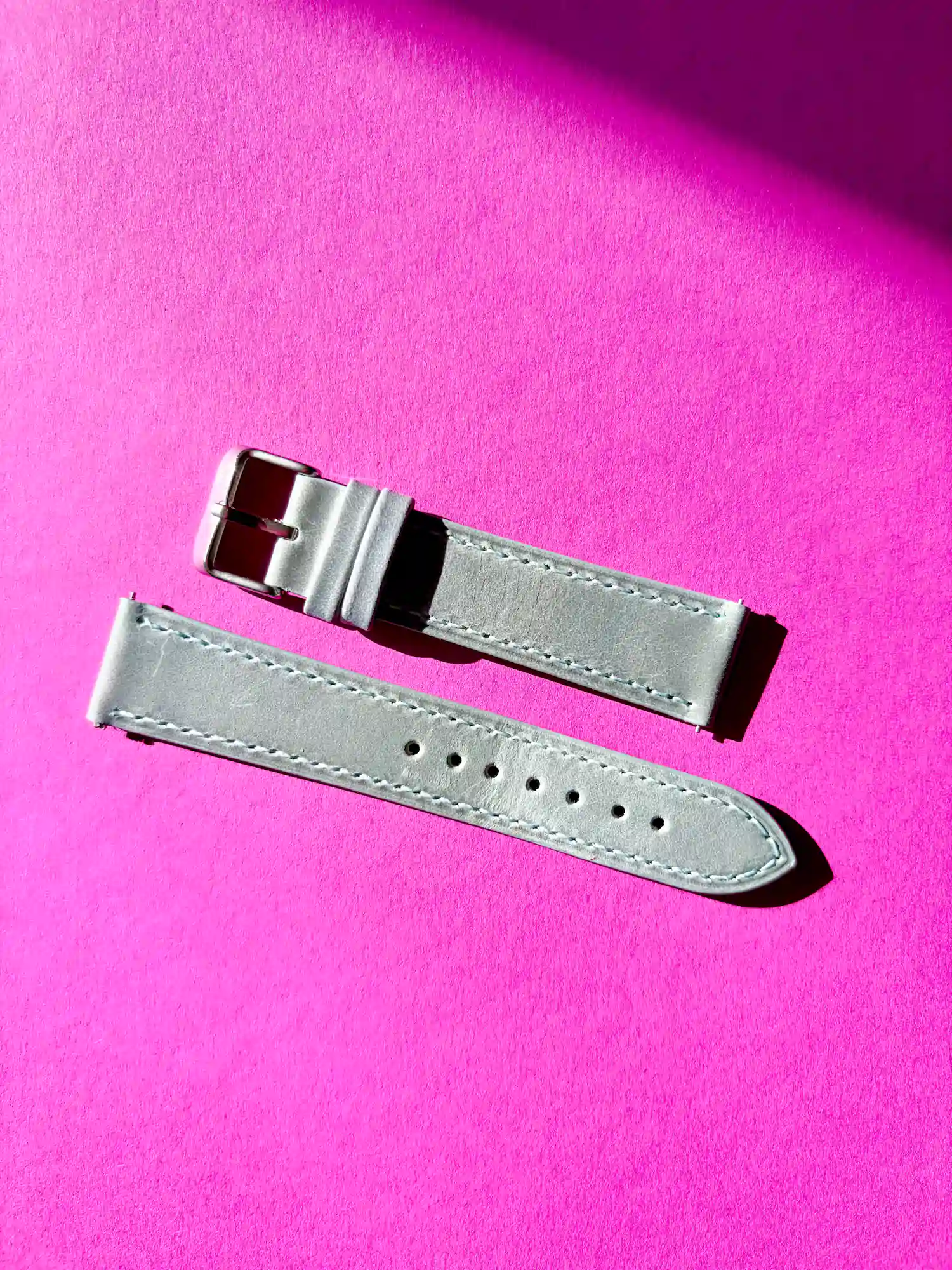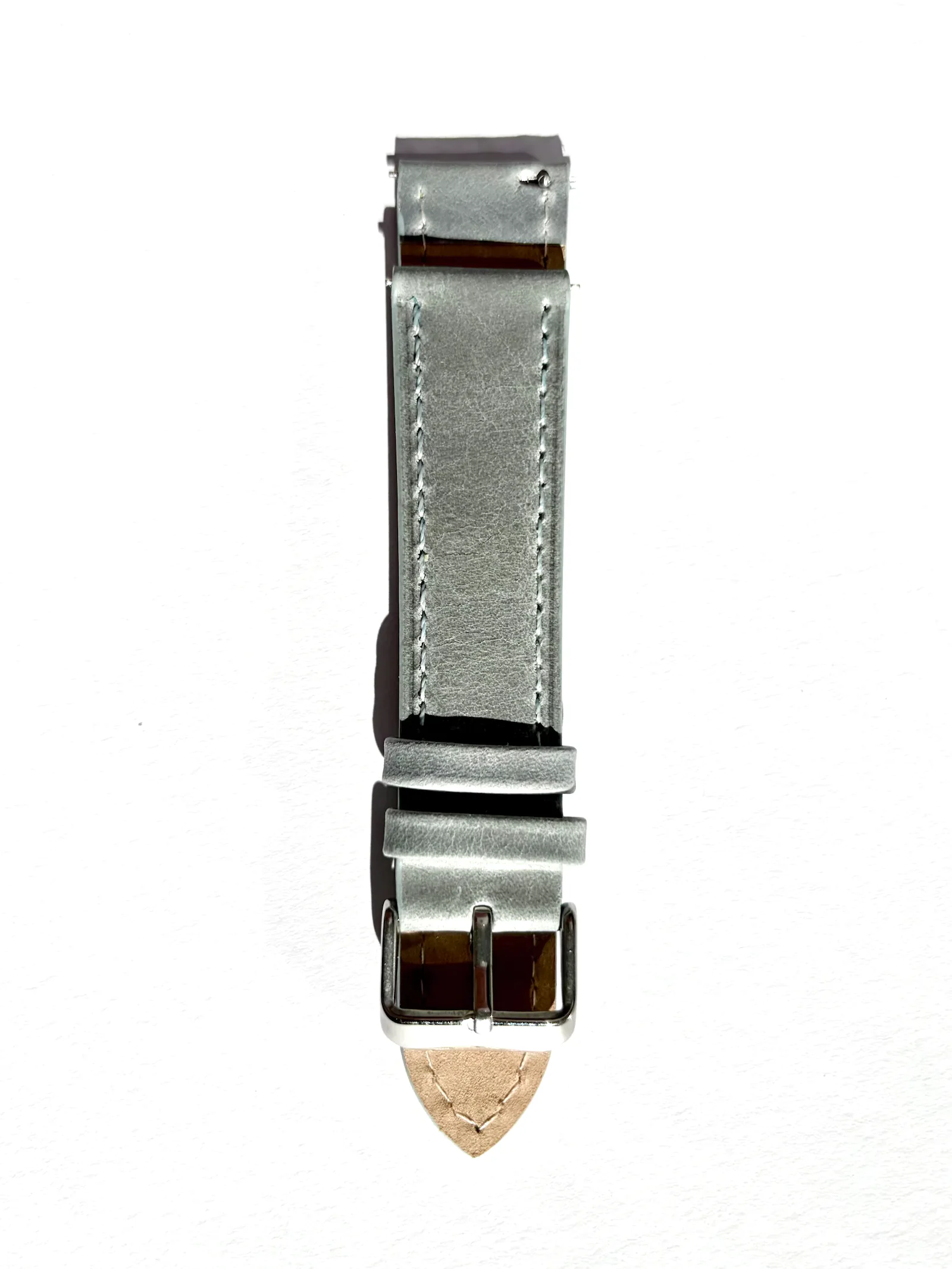 Our grey-blue watch strap comes with quick-release spring bars, so you can attach it quickly and easily to any standard watch. Thanks to its handcrafted construction and continuous stitching, it's durable.