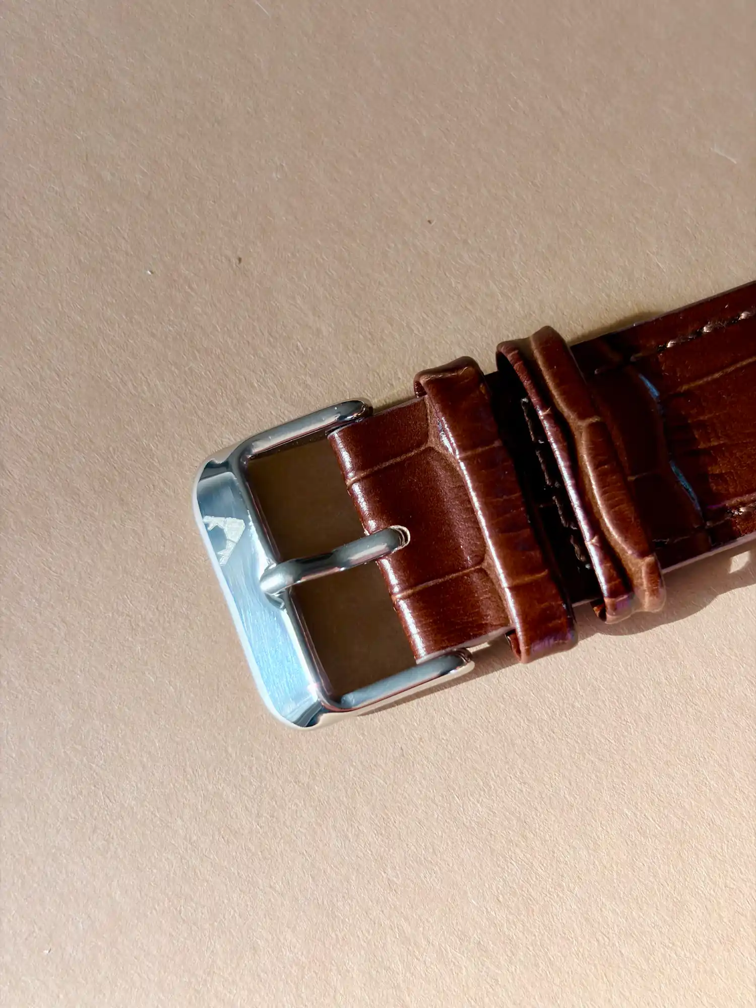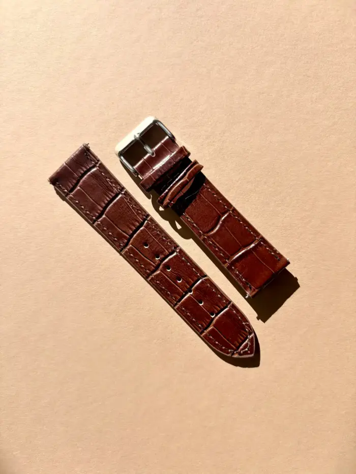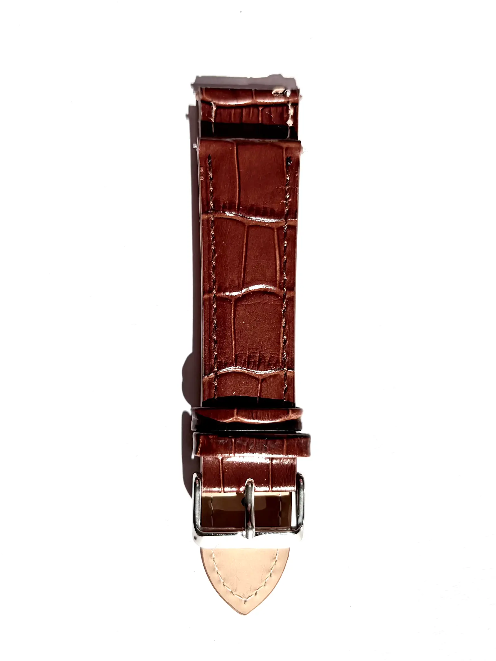 Our fawn-brown crocodile-style watch strap. The high-quality cowhide leather is embossed with a crocodile texture, eliminating any crocodile leather. The leather strap features a sophisticated fawn-brown hue that complements gold tones particularly well.