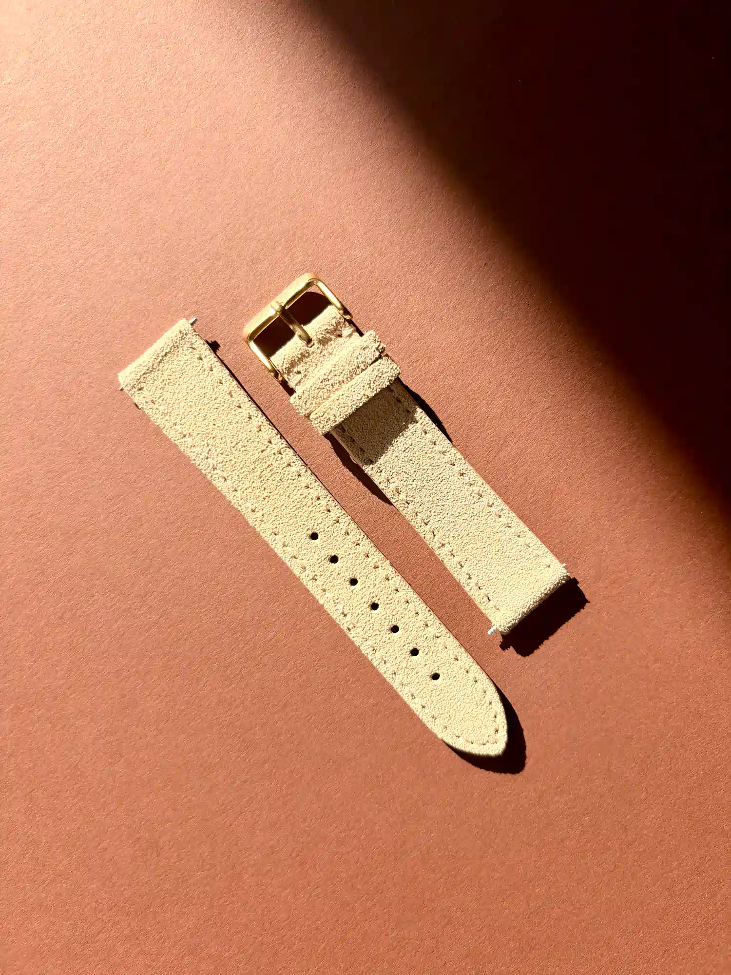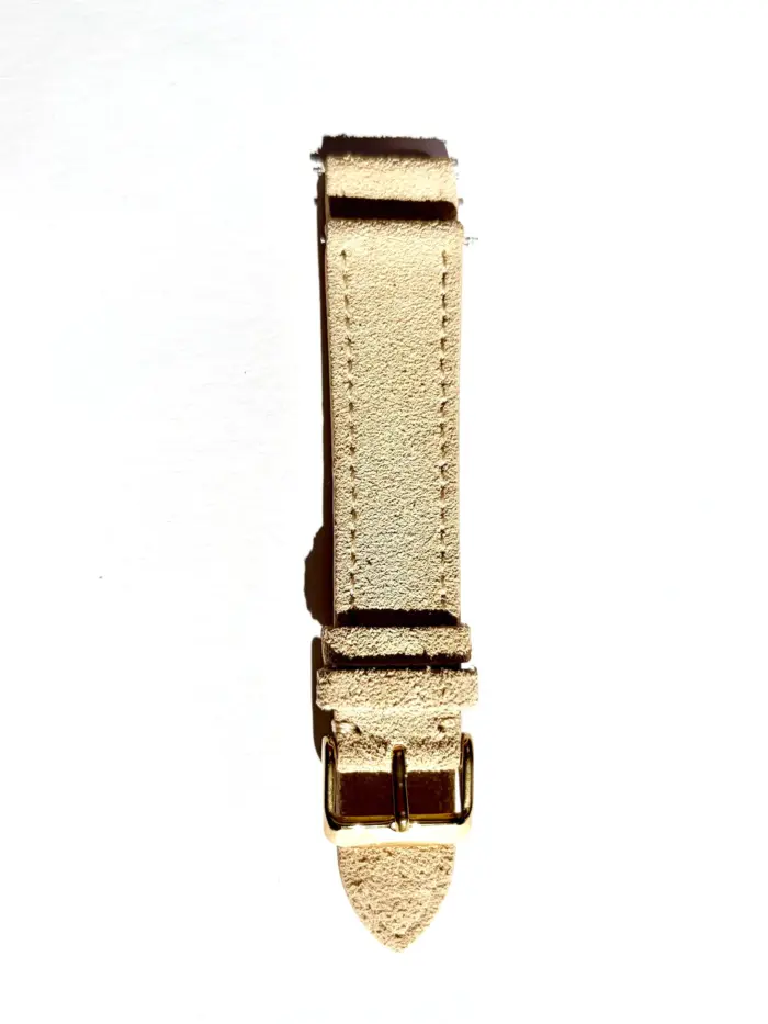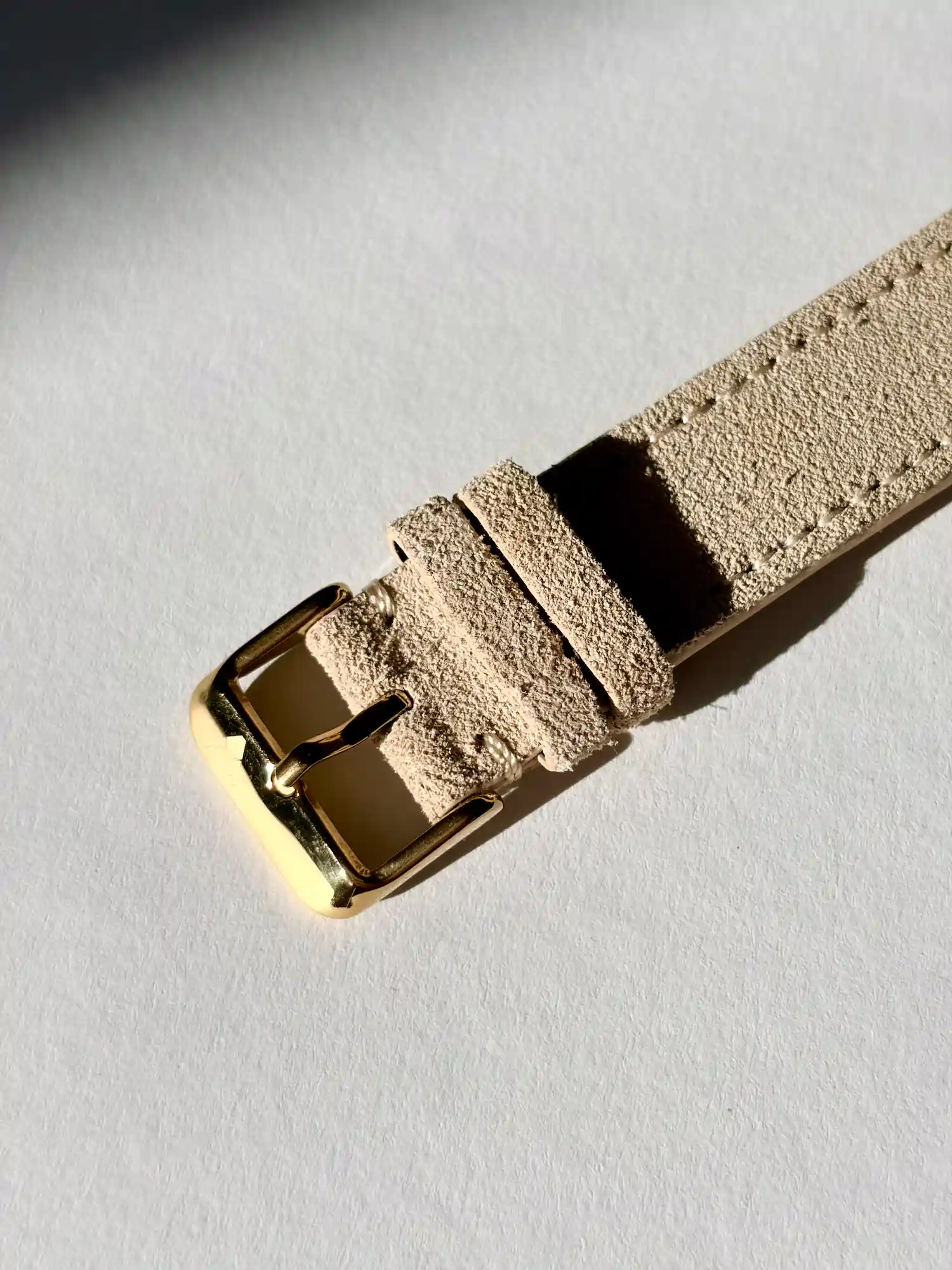 Our champagne-colored watch strap is made of soft suede with light-colored thread. It's extra durable thanks to two layers of suede and continuous stitching.