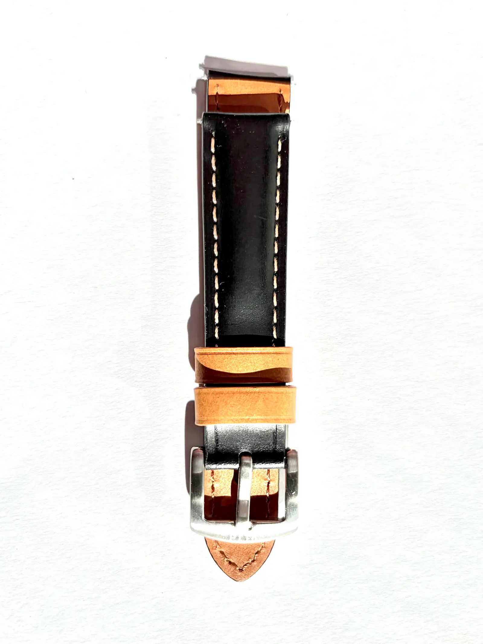 Our black and brown leather strap features a rustic style with light contrast stitching. The thick and sturdy smooth leather and matte clasp pair perfectly with stainless steel sports watches.