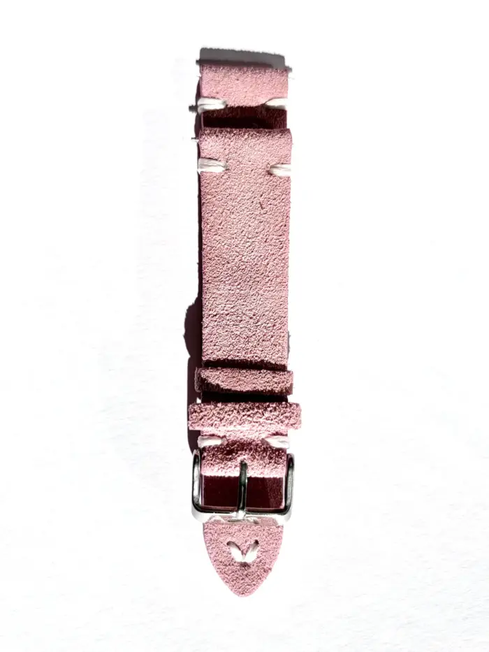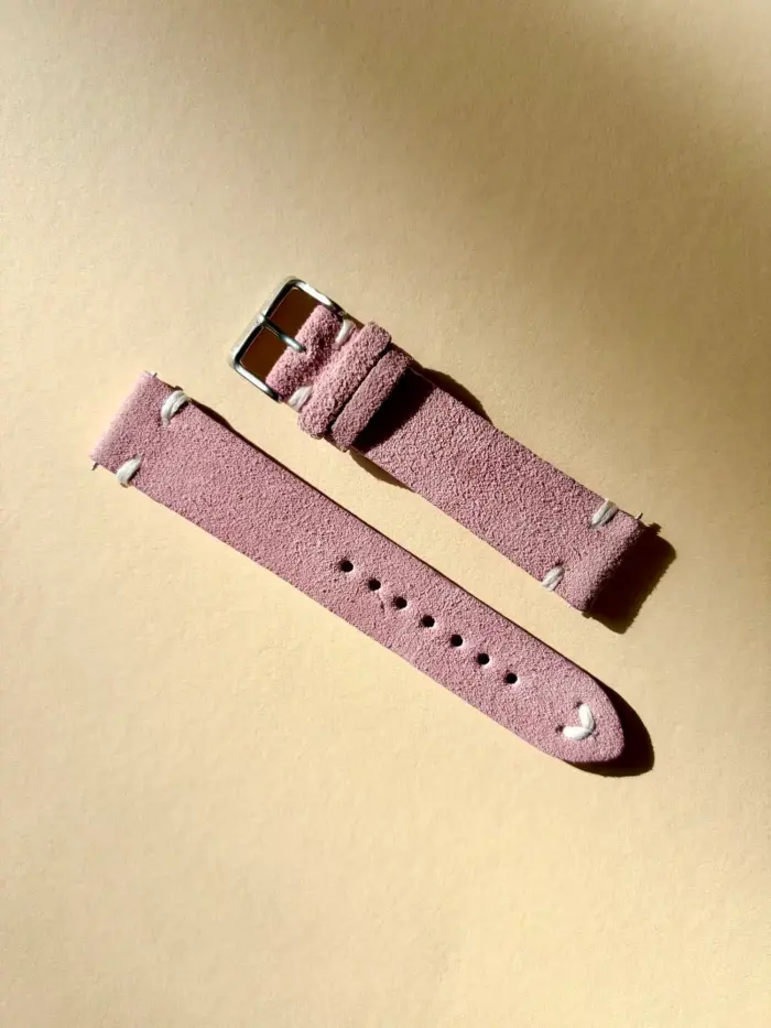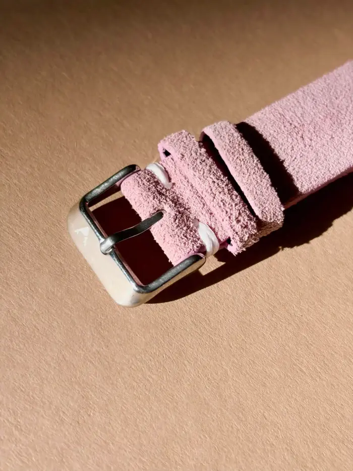 Das Uhrenarmband wird von Hand aus Wildleder gefertigt. Es ist an den Kanten versiegelt gegen das Eindringen von Flüssigkeiten. Der rosa Farbton passt ausgezeichnet in den Frühling und Sommer.