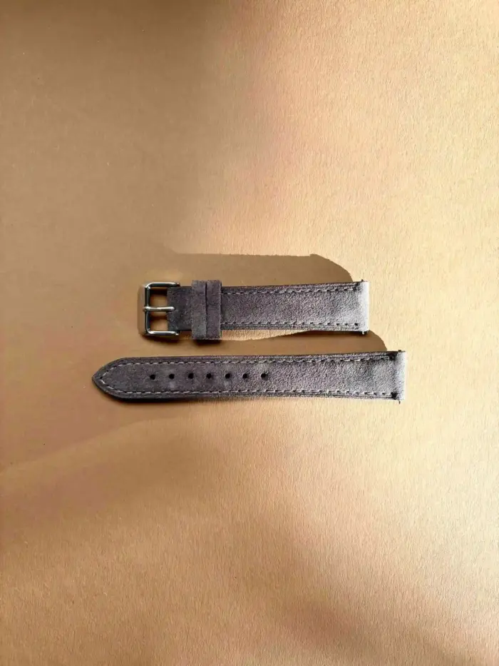 Unser Manufaktur Uhrenarmband aus festem grauem Wildleder und Naht.