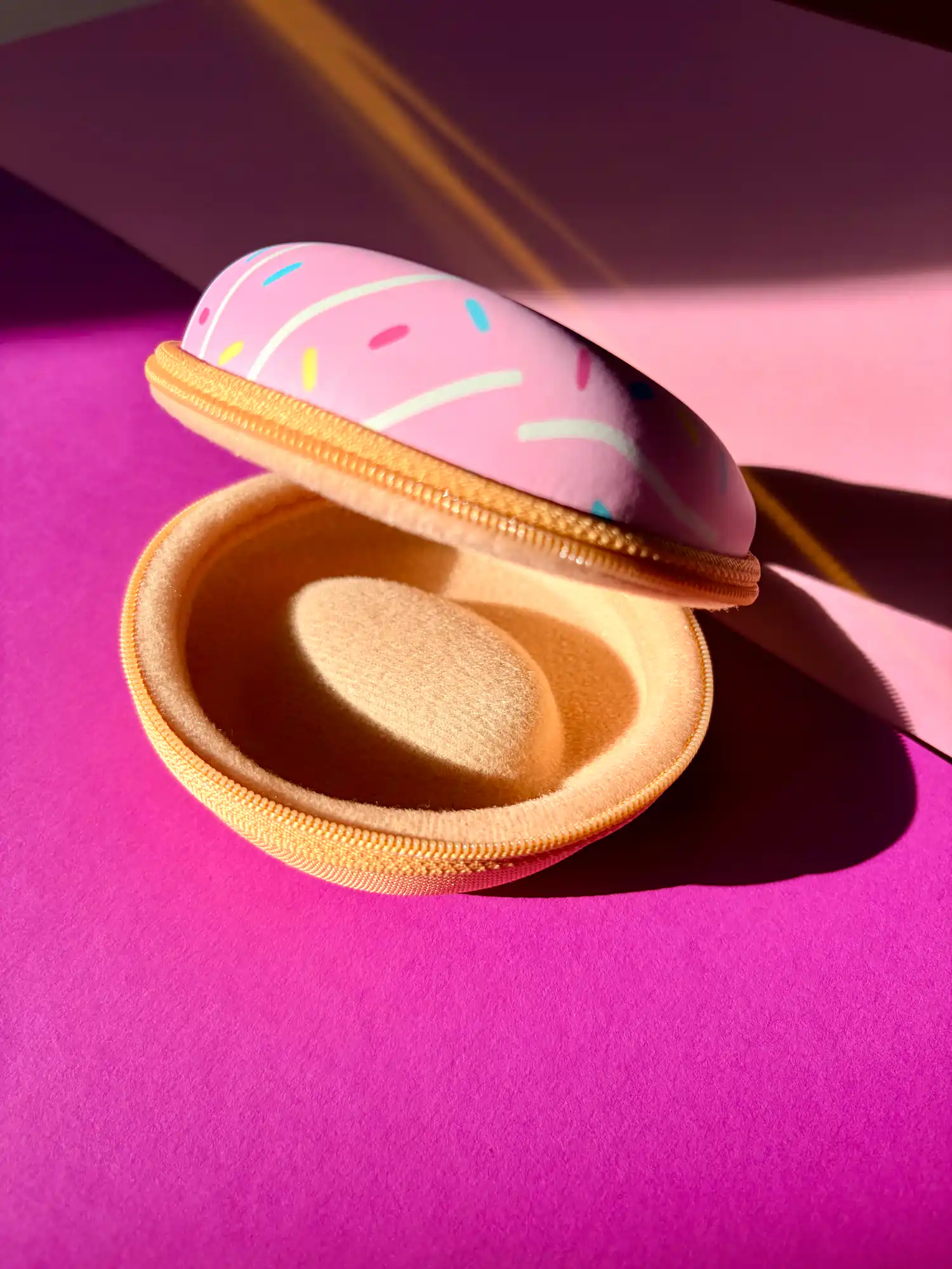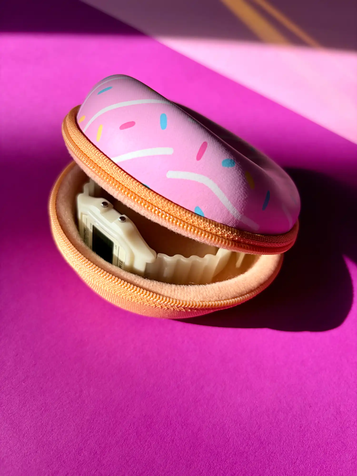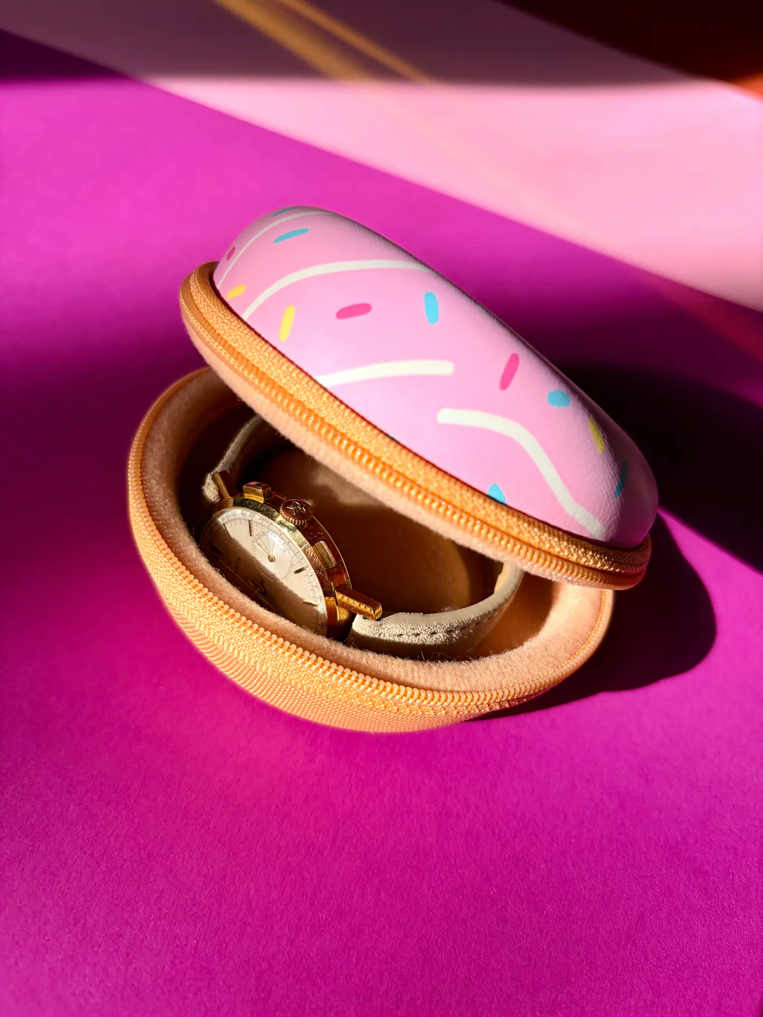 Unser Donut Case Rosé mit feinen Streuseln und stoßfestem Frosting. Die formstabile Hartschale ist innen weich gepolstert, sodass deine Uhr zuverlässig vor Kratzern geschützt ist. Zwei zusätzliche Schaumstoffpolster sorgen dafür, dass auch kleinere Uhren sicher fixiert werden.