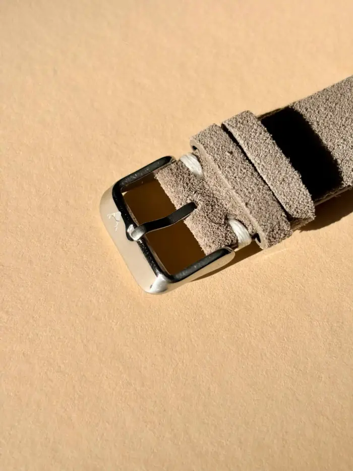 wildleder uhrarmband vintage grau beige Edelstahl Dornschließe im Sonnenlicht von vild Hamburg