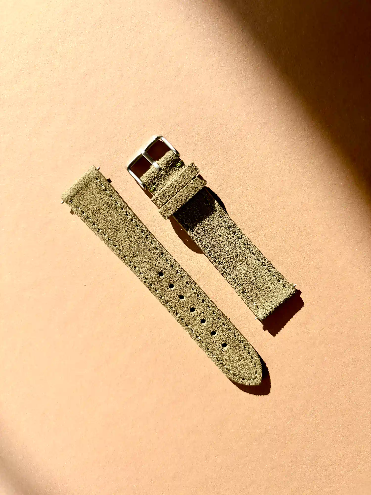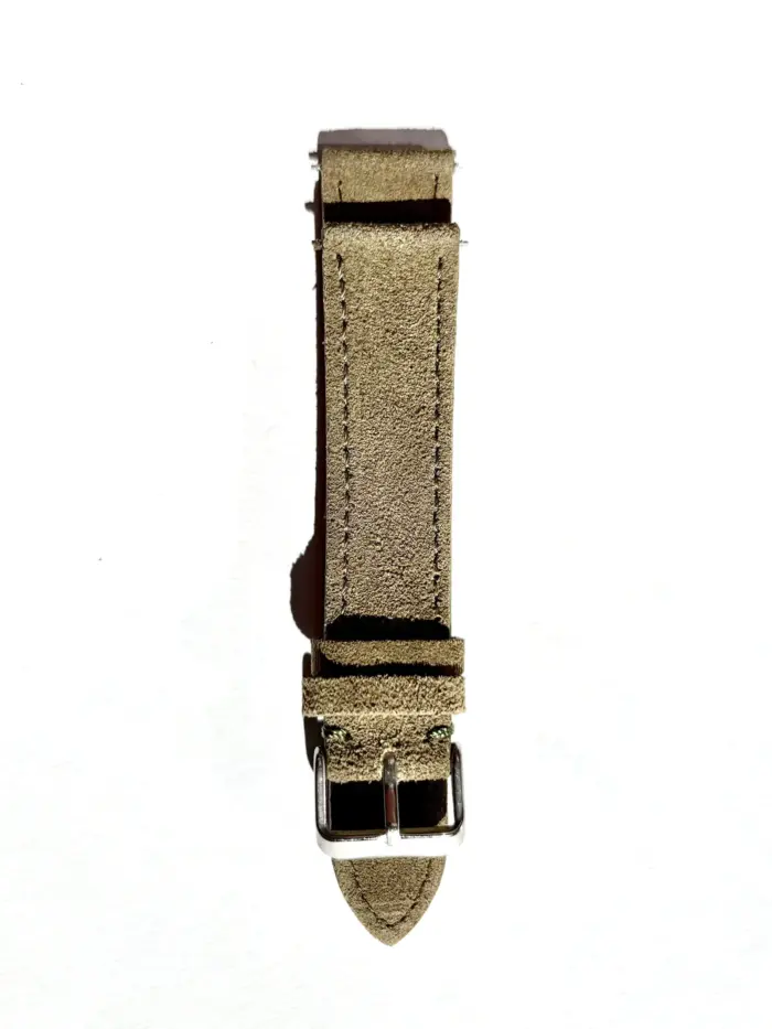 Der Farbton unseres Uhrenarmbands erinnert an grüne Olivenhaine der Toskana. Es besteht aus zwei Lagen Wildleder und einer klassischen Naht. Das weiche Wildleder lässt sich angenehm am Handgelenk tragen.